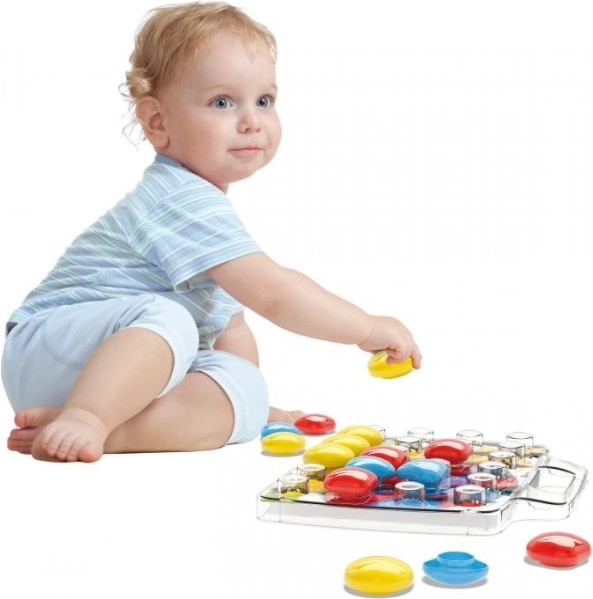 Set sadrži praktičnu kutiju koja se može rasklopiti u osnovu s pločom u koju djeca umeću čepove različitih veličina. Pomoću tih elemenata djeca mogu stvarati zabavne i šarene kompozicije.