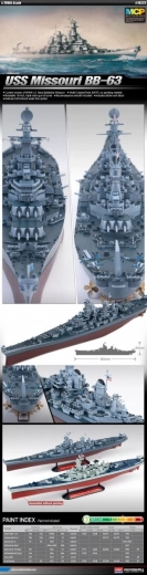 USS Missouri (BB-63), proslavljen kapitulacijom Japana na kraju Drugog svjetskog rata, ubraja se među najslavnije ratne brodove svijeta. Ova plastična maketa u mjerilu 1/700 omogućuje izradu realističnog modela s finim površinskim urezima i vjernim proporcijama klase Iowa. Model je namijenjen lijepljenju i naknadnom bojanju.