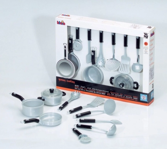 Set posuđa i kuhinjskih dodatakaSadrži 9 stavki uključujući: 2 lonca, tavu, rezač za pizzu, kutlaču i još toga.Igračka je prikladna za djecu od 3 godine naviše..