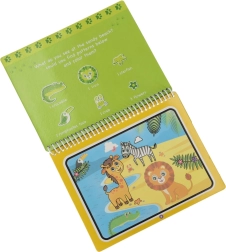 Spiralni uvez olakšava okretanje listova, a šareni motivi životinja pozivaju na otkrivanje i učenje kroz igru.