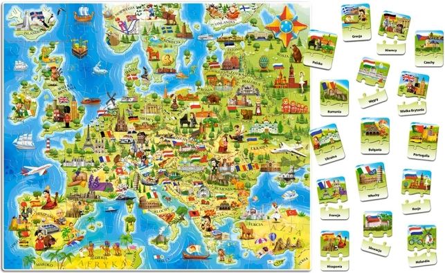 Otkrijte Europu kroz igru s edukativnim puzzleom Castorland! Set sadrži kartu Europe od 180 dijelova dimenzija 46 × 60 cm te dodatnih 32 kviz-dijela za dodatno vježbanje. Idealan za djecu od 7 godina – zabavan način učenja geografije, povijesti i kulture. Šarene ilustracije kultnih znamenitosti, kvalitetna izrada i edukativan sadržaj potiču logičko razmišljanje i pamćenje.