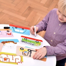 Set CzuCzu Vozila donosi djeci mnoštvo pametnih aktivnosti s motivima različitih prijevoznih sredstava. Knjižica na vezici prepuna je raznobojnih ilustracija i zadataka koje je, zahvaljujući brisivom flomasteru, moguće rješavati iznova i iznova. Praktično pakiranje s ručkom odlično je za kod kuće, u gostima ili u automobilu.