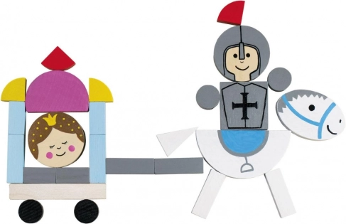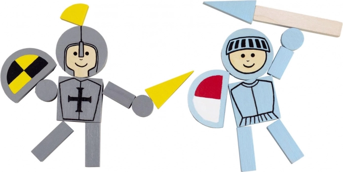 Šareni drveni elementi s glatkom površinom omogućuju djeci slaganje vitezova, štitova, kopalja i udova – idealno za razvoj motorike i mašte.