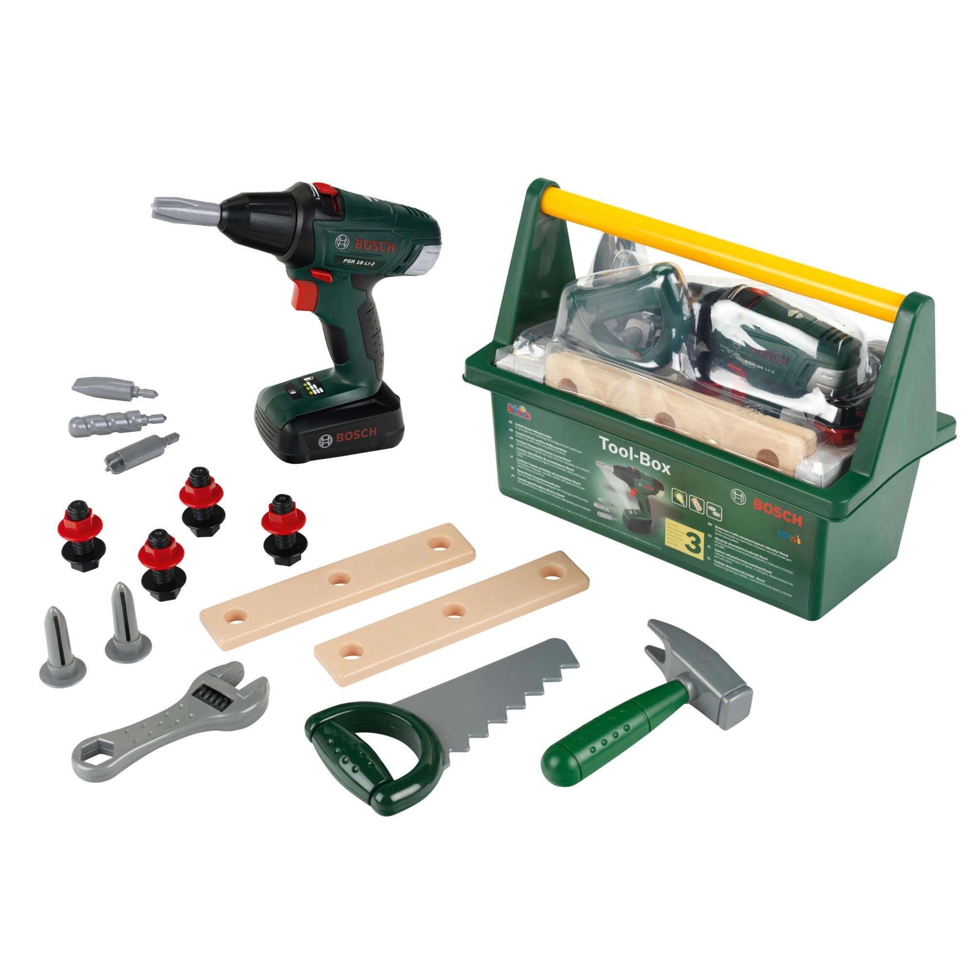 Glavna zvijezda je bežična aku bušilica/odvijač sa zvukom, svjetlosnim efektom i rotirajućim vijkom, koja odlično simulira rad pravog alata. Ne nedostaju ni 4 zamjenjiva nastavka, pilica s udobnim držačem, čekić, francuski ključ, 2 plastične pločice s rupama, 4 vijka i 2 čavla – sve od izdržljive plastike.