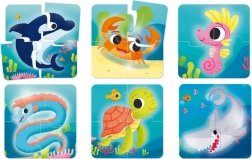 Ovaj set sadrži 6 ilustriranih kartica s morskim životinjama, od kojih se svaka sastoji od 4 velika dijela. Zahvaljujući intenzivnim bojama i jednostavnim oblicima djeca se lako snalaze i brzo shvaćaju princip slaganja. Veličina dijelova prilagođena je malim rukama i potiče koordinaciju oko–ruka.