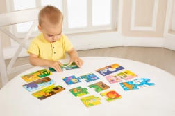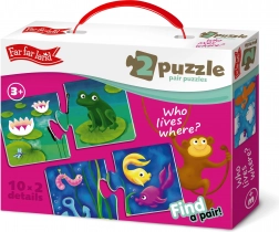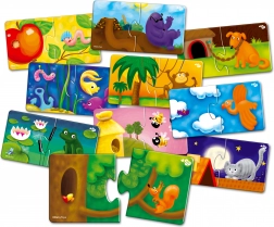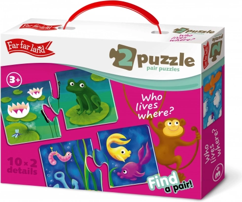 Far Far Land Puzzle idealna je edukativna igračka za djecu od tri godine. Ovaj set sadrži 10 puzzle slika, od kojih se svaka sastoji od dva dijela – na jednom je životinjica, a na drugom njen stanište. Kroz ovu igru, djeca uče prepoznati različite vrste životinja i njihova staništa, čime razvijaju svoju sposobnost sortiranja i kombiniranja.