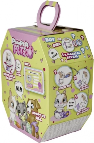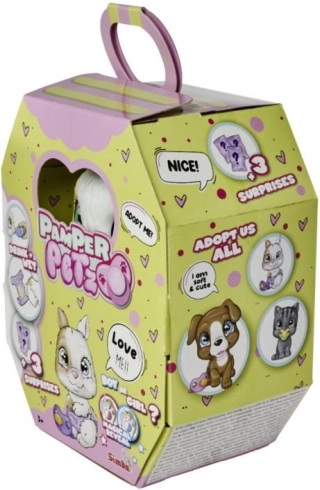 Preslatki zečić iz serije Pamper Petz traži novog skrbnika koji će mu dati ime i obasipati ga ljubavlju. Zna piti pravu vodu iz bočice i piškiti u pelenu koja nakon namakanja mijenja boju. Zahvaljujući magičnoj šapici otkrit ćete je li curica ili dečko. U pakiranju se nalazi kartonska prijenosna “kućica” s ručkom te iznenađujući dodaci. Prikladno od 3 godine.