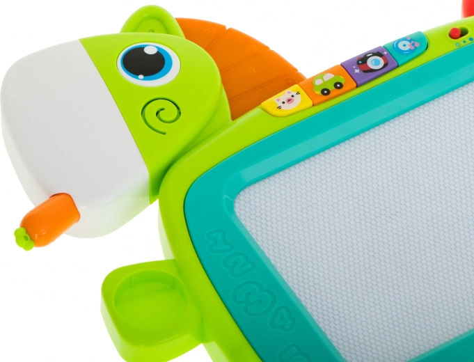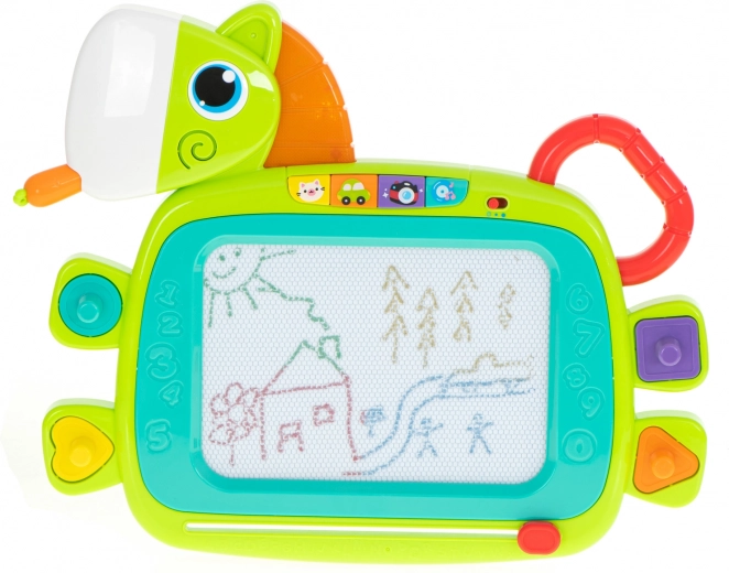 Interaktivni elementi donose zvukove životinja, zvukove prijevoznih sredstava, zvukove iz kućanstva i vesele melodije. Igračka ima 2 razine glasnoće i mogućnost potpunog isključivanja zvuka. Olovka u obliku mrkve pri umetanjу u „usta” konjića proizvodi efekt krckanja. Rubove ploče krase izbočena slova i brojke – idealno za prvo upoznavanje s oblicima.
