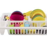 Veseli dječji kuhinjski set u praktičnom ocjeđivaču donosi sate kreativne zabave. Sadrži sve što mali kuhari trebaju: tanjuriće, šalice s tanjurićima, pribor za jelo, lonac s poklopcem i tave. Žive boje privlače pažnju i razvijaju maštu, finu motoriku i navike reda – nakon „kuhanja“ posuđe se jednostavno odloži u ocjeđivač kao kod mame.