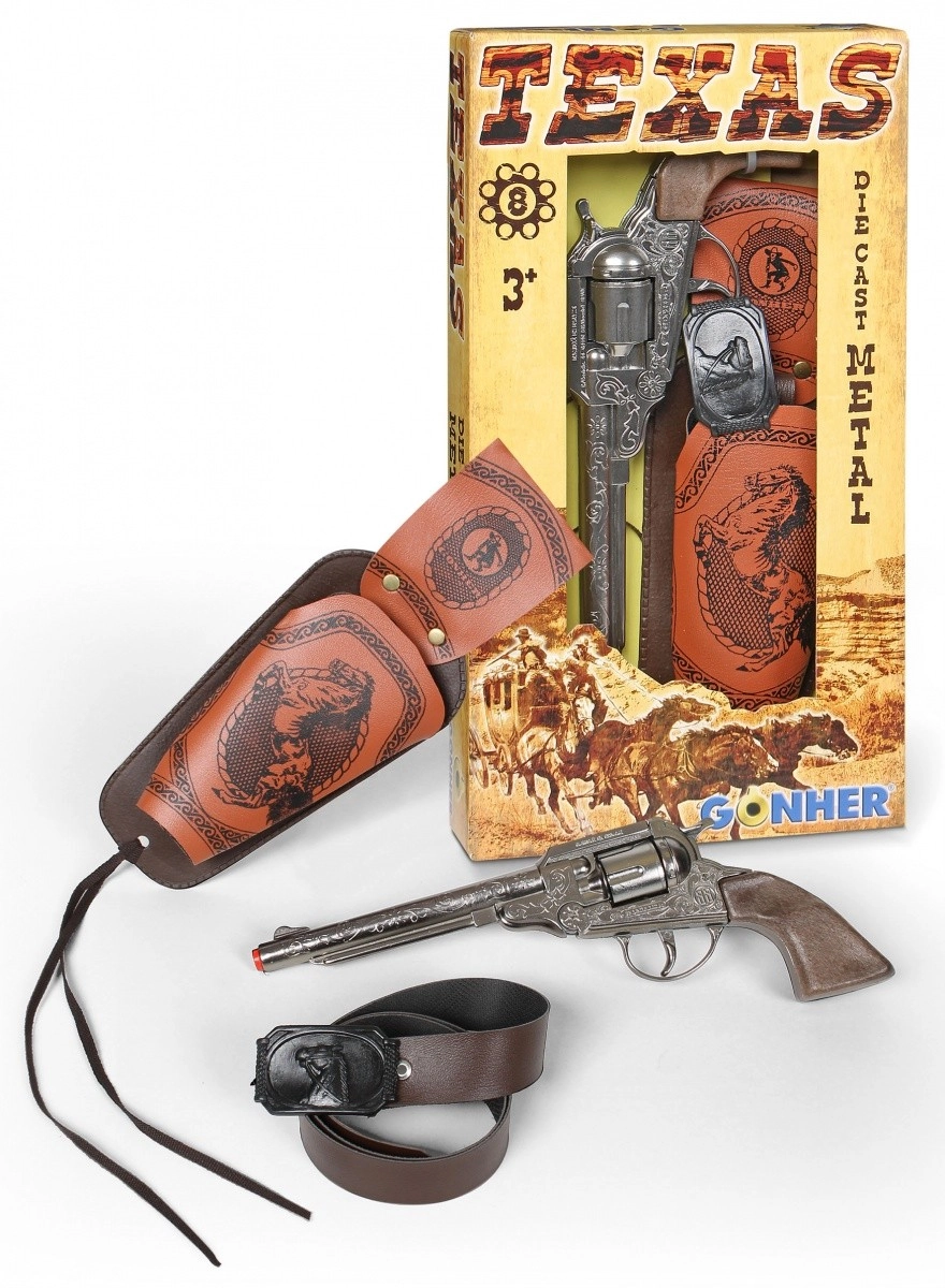 METALNI KAUBOJSKI REVOLVER GONHER 150/0 S KUTIJOMMetalni kaubojski revolver za 8 metaka s futrolom u pakiranju.