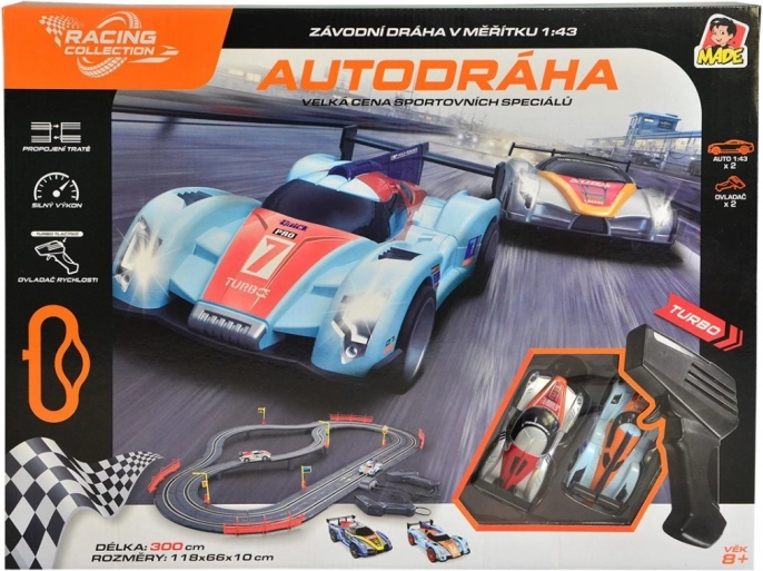 Dio pakiranja su dva trkaća automobila i dva ručna upravljača za trenutne startove i preciznu kontrolu brzine. Autostaza je pakirana u hrvatskoj kutiji i idealna je kao poklon za male i velike zaljubljenike u utrkivanje.