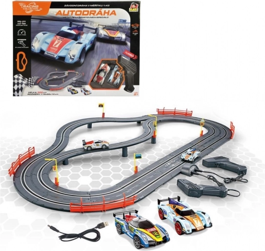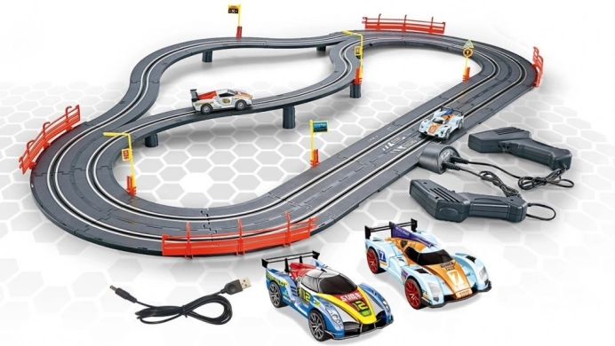 Autostaza 300 cm s USB napajanjem bez izvora. Dva automobila, dva upravljača, most i pribor. Sjajna zabava za djecu od 8 godina i odrasle.