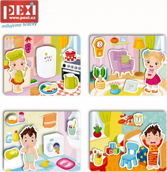 Velcro slagalice Dom na zabavan način upoznaju djecu s predmetima iz svakodnevice i njihovim pravilnim smještajem u kućanstvu. Zahvaljujući fleksibilnim plastičnim pločicama i dijelovima s čičak trakom, rukovanje je jednostavno i sigurno. Posebna površinska obrada ugodna je na dodir i potiče samostalnu igru.