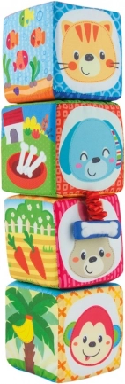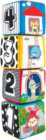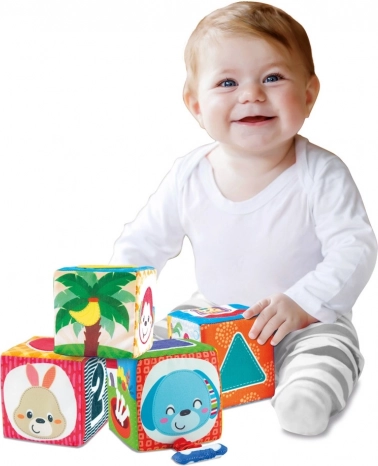 - 4 mekane kocke s tekstilom i pjenastom ispunom za sigurnu igru.