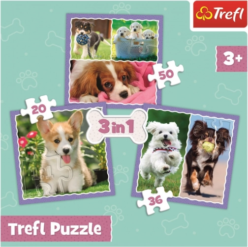 Dječje puzzle Trefl 3u1 sa slatkim štencima. Tri zasebne slike 200 × 195 mm, različit broj dijelova, ekološki materijali. Prikladno od 3 godine.
