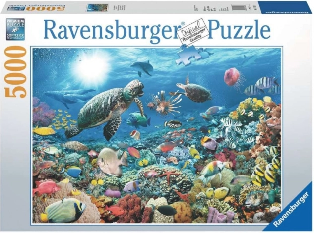 Ovaj puzzle prikazuje živopisan podvodni svijet prepun šarenih riba, kornjača i koralja, što ga čini vizualnim užitkom.