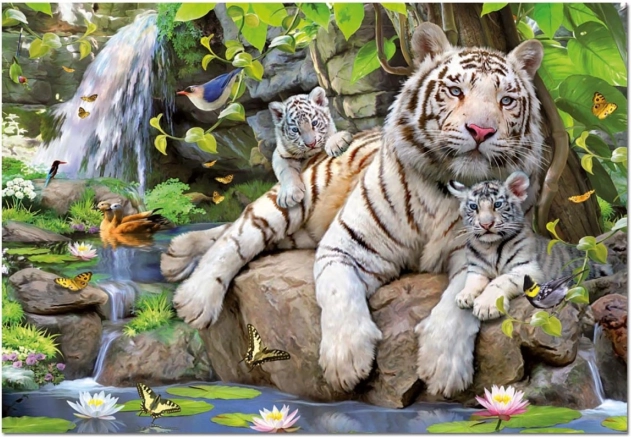 Edicija puzzli Bijeli Tigrovi donosi vam prekrasan prizor s bijelim tigrovima u bujnoj džungli. Ove puzzle od 1000 dijelova nude ne samo zabavu, već i mentalnu vježbu; zahvaljujući svojoj trajnosti i elegantnim bojama idealan su poklon!