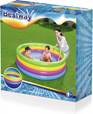 Razveselite djecu i priredite im ljeti sigurne vodene igre. Nafukavajući dječji bazen BESTWAY s duginim prstenovima dimenzija 157 × 46 cm ima mekano dno, izrađen je od izdržljivog PVC-a i prima do 522 l vode – idealno za djecu od 3 godine.