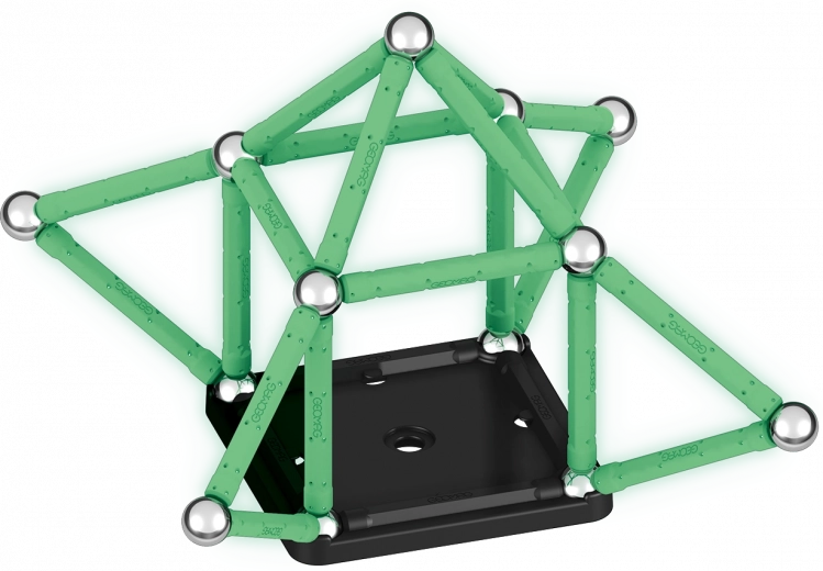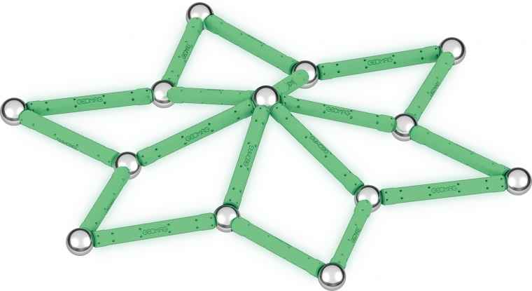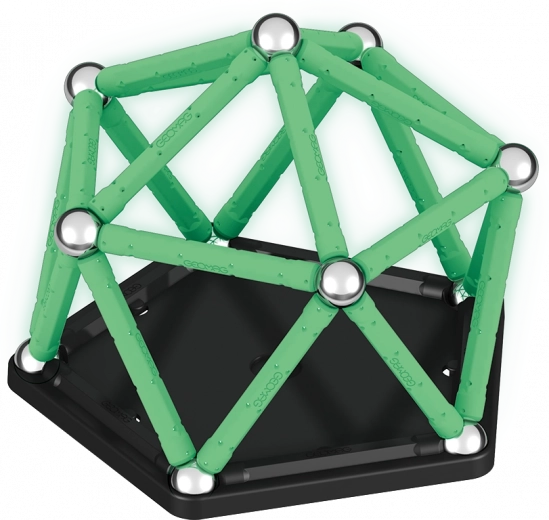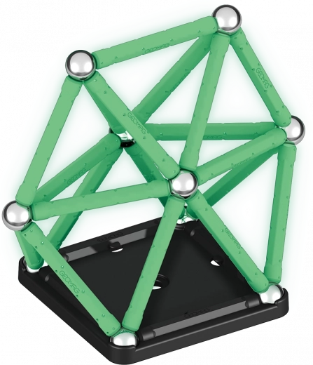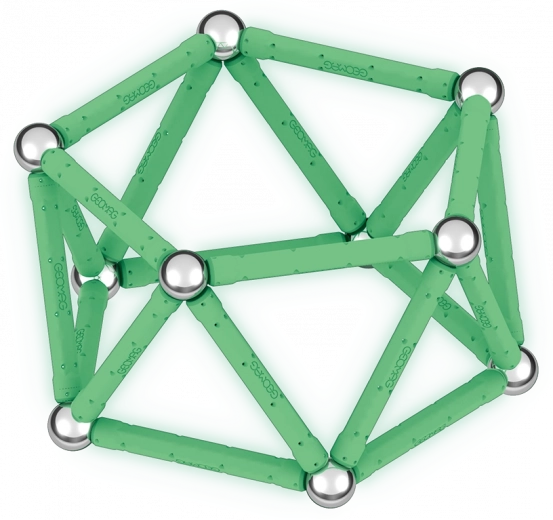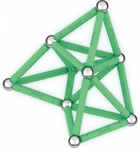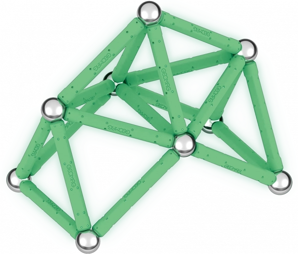 GEOMAG Glow je originalni magnetski građevni set koji omogućuje stvaranje neograničenog broja konstrukcija pomoću magnetskih štapića i čeličnih kuglica. Zahvaljujući fosforescirajućim dijelovima, tvoji modeli će nakon osvjetljavanja u mraku prekrasno svijetliti – idealno za zabavne eksperimente i atraktivnu nastavu.