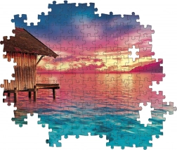 Uronite u meditativni ritam slaganja s puzzle CLEMENTONI Peace – Living the Present. Zasićene boje, pažljiv tisak i savršeno uklopljeni dijelovi osiguravaju ugodan doživljaj i prekrasnu sliku kućice na stupovima iznad mirne površine pri zalasku sunca.