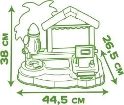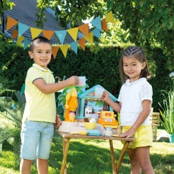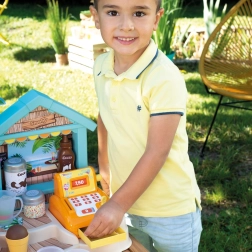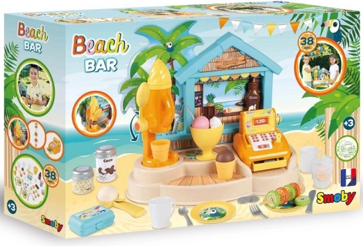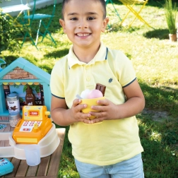 SMOBY plažni bar je kreativni dječji štand za igru prodavača i kupaca. Djeca mogu isprobati pripremu sladolednih kupova, smoothieja i voćnih ražnjića, ukrašavanje preljevima i posipima te naplaćivanje kupnje na funkcionalnoj blagajni. Realistični detalji potiču maštu, društvene vještine i finu motoriku.