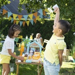 Bogati set od 38 dodataka uključuje uređaj za sladoled, kornete i kuglice, žlicu za sladoled, voćni ražnjić, posipe, posuđe, pribor za jelo i blagajnu. Zahvaljujući kompaktnim dimenzijama, štand je odličan za vrt, park i plažu – idealan za male domaćine ljetnih zabava.