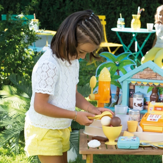 Djeca mogu miješati osvježavajuće napitke, posluživati kuglasti sladoled i ukrašavati slatkim posipima. Realistična oprema pretvara svaku igru u mali ljetni festival okusa.