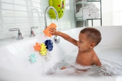 Pretvorite kupanje u malu laboratoriju! Šareni zupčanici s vakuumskim čašicama lako se pričvršćuju na glatku površinu kade ili pločica. Kad preko njih pustite vodu, počinju se okretati i zajedno čine interaktivni vodeni sustav koji motivira djecu na otkrivanje i eksperimentiranje.