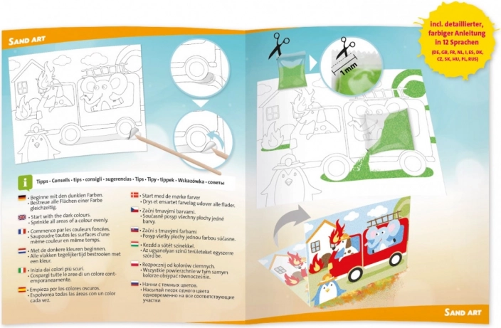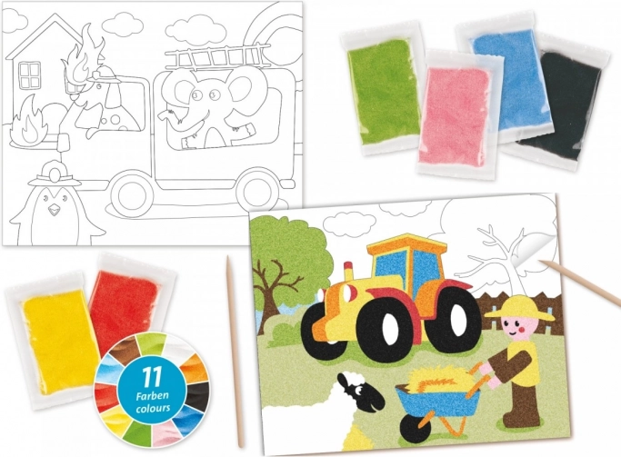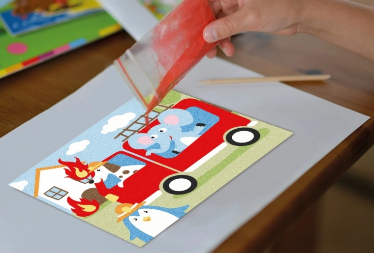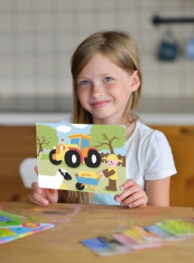 Ovaj kreativni set s pijeskom odličan je izbor za male stvaratelje od 6 godina nadalje. Pojedine dijelove motiva dovoljno je postupno otkrivati i posipati obojenim pijeskom – boje se hvataju na samoljepljivu površinu i nastaje jasan, čist prikaz. Set nudi dva omiljena motiva: traktor i vatrogasno vozilo.
