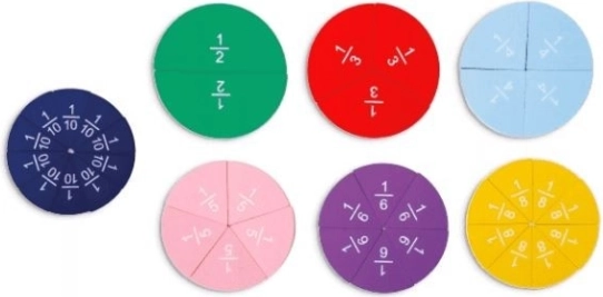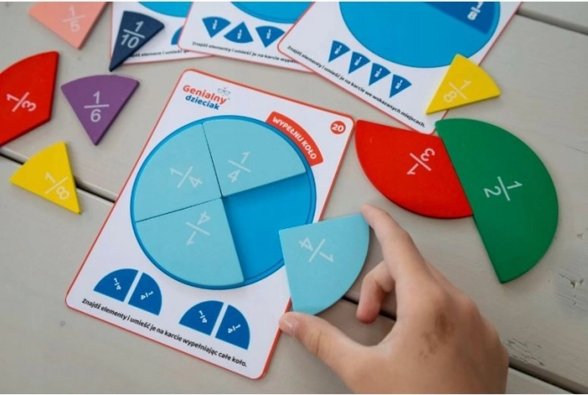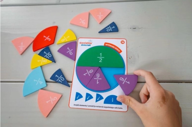 Set sadrži drvene elemente koji prikazuju razlomke 1/2, 1/3, 1/4, 1/5, 1/6, 1/8, 1/10, a set je dopunjen odgovarajućim radnim kartama.