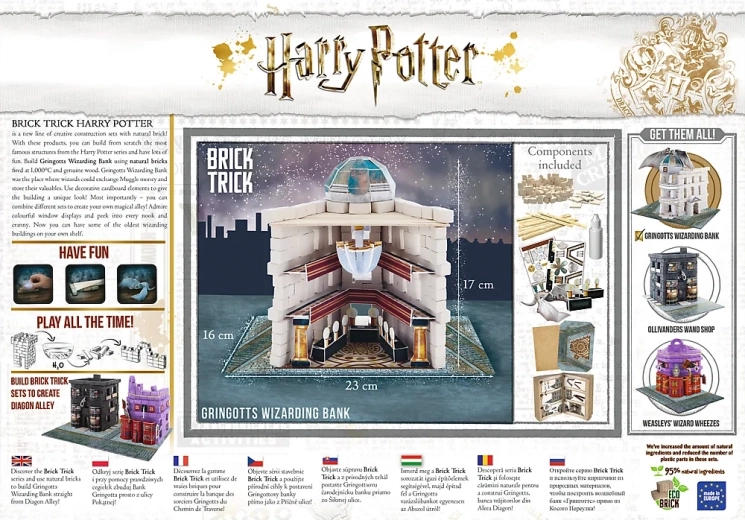 Otkrijte zabavu gradnje s jedinstvenim setom Brick Trick HARRY POTTER koji vam omogućuje korak po korak izgraditi slavnu Gringotts čarobnjačku banku. Od prirodnih materijala napravit ćete čvrstu i detaljnu zgradu koju ćete upotpuniti priloženim dekoracijama – uključujući ikonične elemente iz svijeta čarolija.