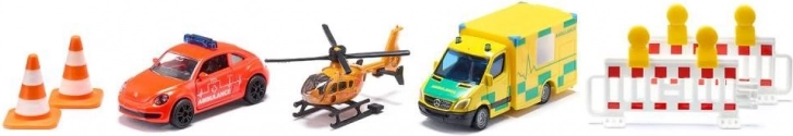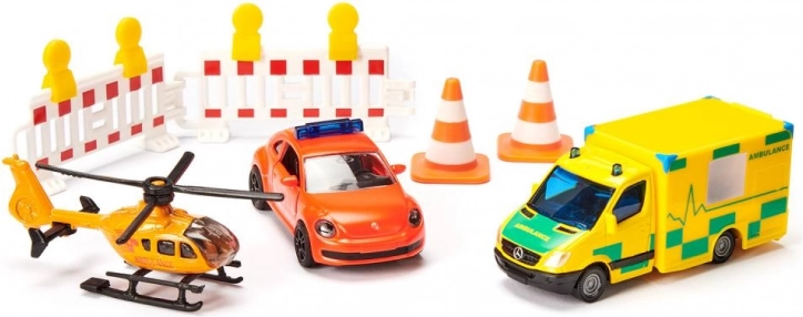 Poklon set SIKU: ambulantno vozilo, spasilačko vozilo i helikopter s čunjevima i barijerama. Metalni modeli s funkcionalnim detaljima za realističnu igru.