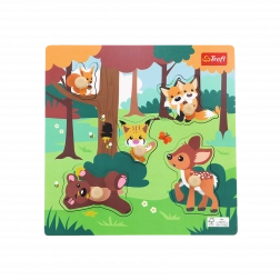 Otkrijte kvalitetne drvene puzzle s motivom šumskih životinja za najmlađe. Sadrže 5 izvadivih dijelova s drvenim gumbom i podlogu s označenim obrisima za lako slaganje. Ova igračka potiče razvoj fine motorike, učenje oblika i koordinaciju oko–ruka. Idealna opcija za djecu od 18 mjeseci.