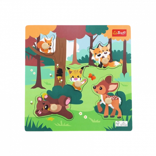 Drvena slagalica s živopisnom grafikom šumskih životinja osmišljena je tako da djecu zabavi i istovremeno razvija njihove vještine. Svaki je dio čvrst, lako se drži i opremljen je drvenim gumbom za jednostavno vađenje. Podloga ima izrezane oblike s crno-bijelim crtežom koji odgovara dijelu, što djeci pomaže u intuitivnom sparivanju.