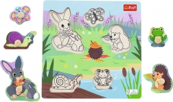 Drvena slagalica Životinje na livadi osmišljena je za male dječje ručice. Pet robusnih dijelova s drvenim gumbićima udobno se hvata i umeće u podlogu s izrezbarenim oblicima. Svako ležište ima odgovarajuću crno-bijelu ilustraciju koja djeci pomaže odrediti gdje dio pripada.