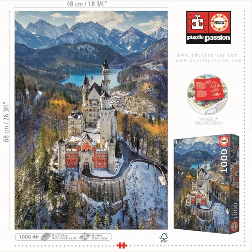 Složite čaroban pogled na dvorac Neuschwanstein iz zraka s ovim puzzleom od 1000 dijelova marke Educa. U pakiranju je uključeno ljepilo FIX PUZZLE® besplatno, koje pomaže sačuvati vaš dovršeni uradak u izvrsnom stanju.