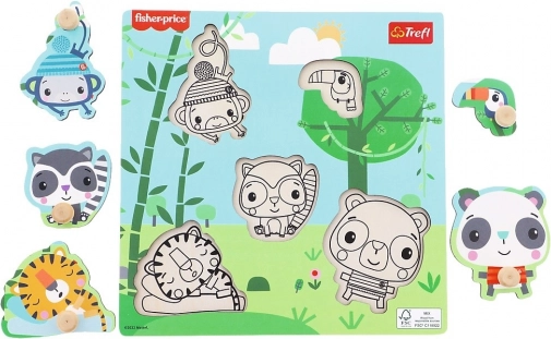 Ova kvalitetna drvena slagalica s umetkom s službenom licencom FISHER-PRICE donosi djeci zabavne motive džungle i intuitivno učenje. Podloga s urezanim obrisima i crno-bijelom grafikom sugerira gdje koji dio pripada, pa se djeca lako snalaze i vesele uspjehu.