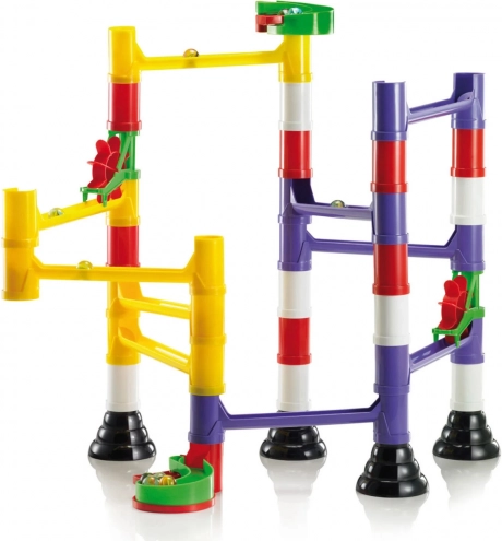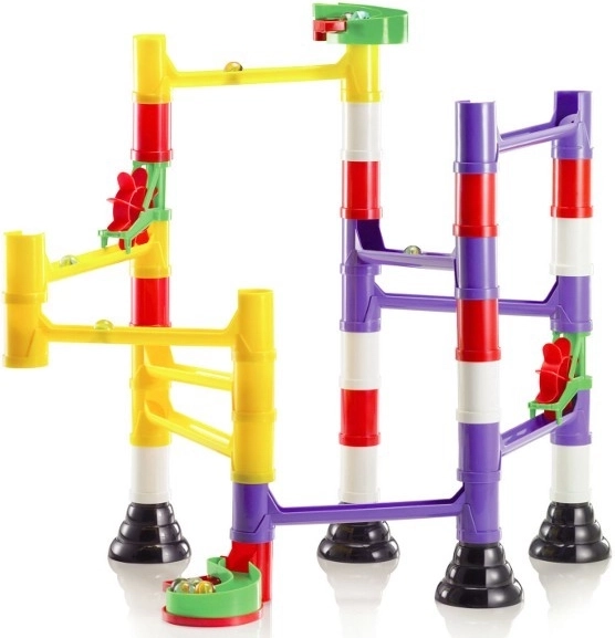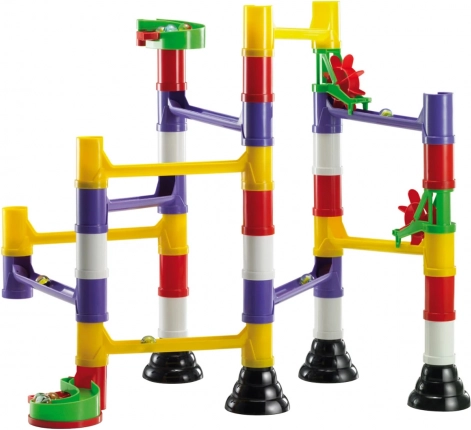 Modularne cijevi, stupići i tračnice precizno se uklapaju. Djeca brzo shvate logiku gradnje i mogu stalno mijenjati rutu kuglica.