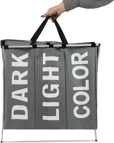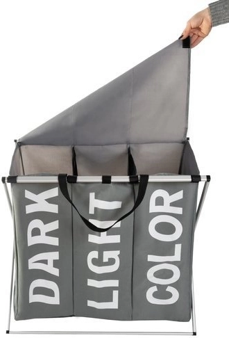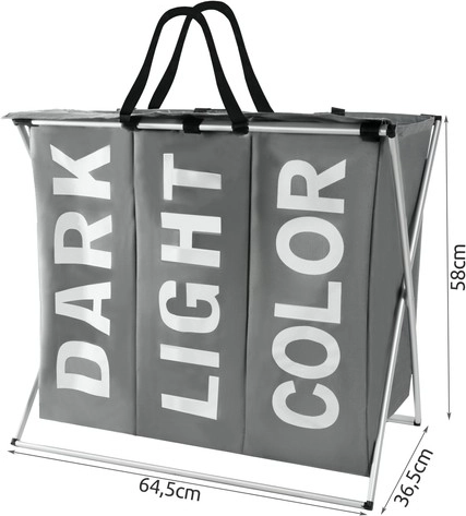 Praktična trodijelna košara za rublje s čvrstom metalnom konstrukcijom i tekstilnim tijelom olakšava svakodnevno razvrstavanje. Zahvaljujući pretincima DARK, LIGHT i COLOR rublje je uvijek pregledno razdvojeno. Unutarnja vodootporna obrada, poklopac na čičak i udobne ručke jamče čistoću, red i lako prenošenje sve do perilice.