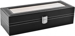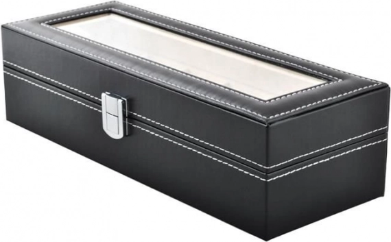Model ima stilski crni dizajn s kontrastnim šavovima, što cijeloj kutiji daje dojam elegancije i luksuza. Stakleni poklopac osigurava da svojim satovima ne samo da pružite zaštitu već ih i efektno izložite.