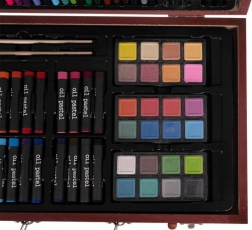 Kompletan likovni set u elegantnom drvenom koferu s ladicom razveselit će male i velike umjetnike. Sadrži čak 148 dijelova: voštane pastele, uljne pastele, drvene bojice, akvarel boje, kistove i druge potrepštine. Praktični kofer s ručkom i metalnim kopčama omogućuje lako prenošenje, pregledno organiziranje i brz pristup svemu što trebate.