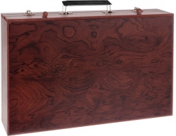 Stilsko drveno kućište s metalnim kopčama i čvrstom ručkom štiti pribor i omogućuje sigurno prenošenje.