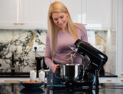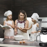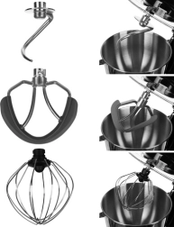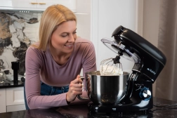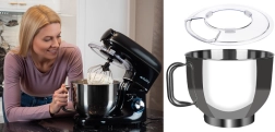 U pakiranju se nalaze tri nastavka: kuka za tijesto, balon pjenjača i miješalica sa silikonskim strugalicama za savršeno spajanje sastojaka. Stabilna baza s protukliznim vakumskim nogicama, sigurnosna brava i LED osvijetljeni upravljački kotačić čine robota pouzdanim partnerom za pečenje i svakodnevno kuhanje.
