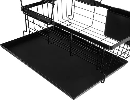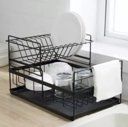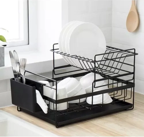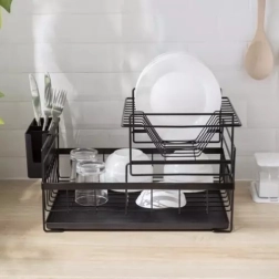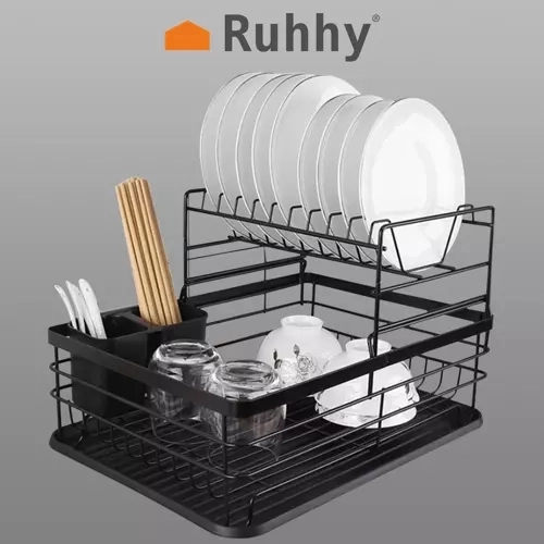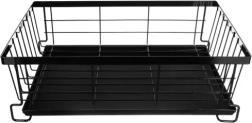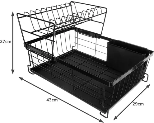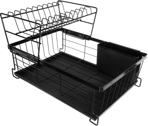 Ovaj dvoslojni ocjeđivač za posuđe učinkovito koristi prostor na radnoj plohi: gornja razina prima do 9 tanjura, donja je idealna za zdjele, čaše i šalice. Konstrukcija od ugljičnog čelika s izdržljivom završnom obradom otporna je na vlagu i svakodnevnu upotrebu, dok protuklizne nožice osiguravaju stabilnost i sigurnost i pri većem opterećenju.