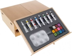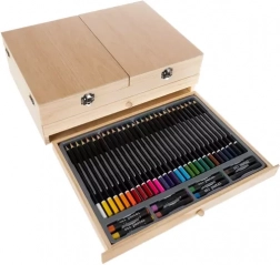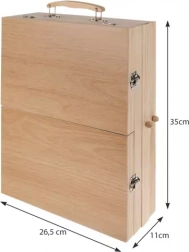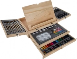 Kompletan 83-dijelni likovni set u drvenom kovčegu s ugrađenim stalkom (easel) za slikanje kod kuće i na putu. Unutra ćete pronaći sve potrebno: akrilne i akvarelne boje, kistove, grafitne olovke različite tvrdoće, pastele, bojice, paletu i skicir. Praktičan drveni kovčeg s ručkom i 2 izvlačne ladice osigurava savršen red i brz pristup svim pomagalima.