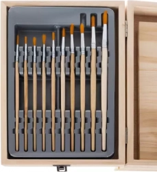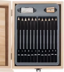- kovčeg sa stalkom, skicir, 10× kist, 12× grafitna olovka (2×H, 2×HB, 2×B, 2×2B, 2×4B, 2×6B), gumica, šiljilo, 8× akrilna boja, plastična paleta, 12× akvarelna boja, 28× bojica, 8× uljni pastel