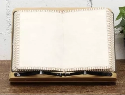Dvije metalne kopče s zaštitnim završecima drže stranice otvorenima, a oslonac sprječava klizanje knjige ili tableta. Sve se može lako sklopiti ravno za pohranu.