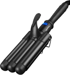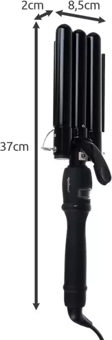 Ova trojna uvijačica s promjerom valjaka 22 mm stvara ujednačene, prirodne valove u trenu – dovoljno je umetnuti pramen, pritisnuti i povući niže. Keramičko PTC grijaće tijelo osigurava brzo i ravnomjerno zagrijavanje te nježan kontakt s vlasima bez nepotrebnog pregrijavanja.