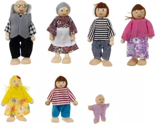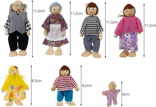 POKRETNI DIJELOVI - likovi imaju pokretne noge i ruke, što igri daje dojam stvarnosti. Cijela je stvar izrađena s naglaskom na detalje. Drvene lutkice odgovaraju kućicama za lutke gotovo svih proizvođača. Klasična ljepota drva i njegova trajnost znače da su uvijek bile visoko cijenjene.