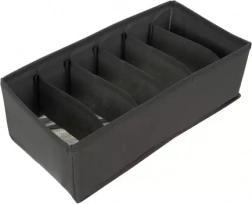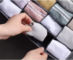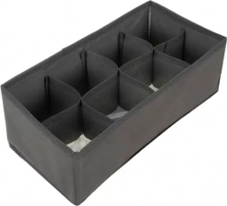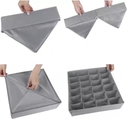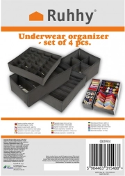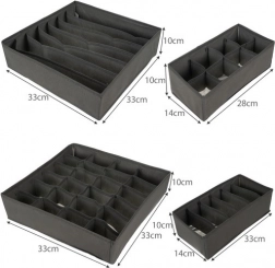 Praktičan set četiri organizatora različitih veličina održat će vaše ladice i ormare savršeno preglednima. Svaka kutija ima čvrsto ojačane stijenke i pametno raspoređene pretince za određene tipove odjeće – od grudnjaka i gaćica do čarapa ili kravata. Prozračna netkana tkanina sprječava nakupljanje vlage i pomaže održati odjeću svježom.